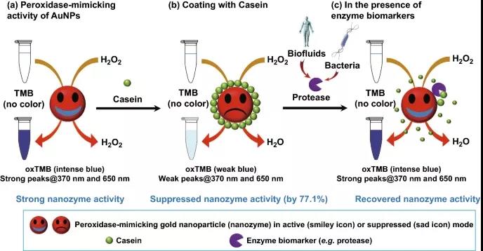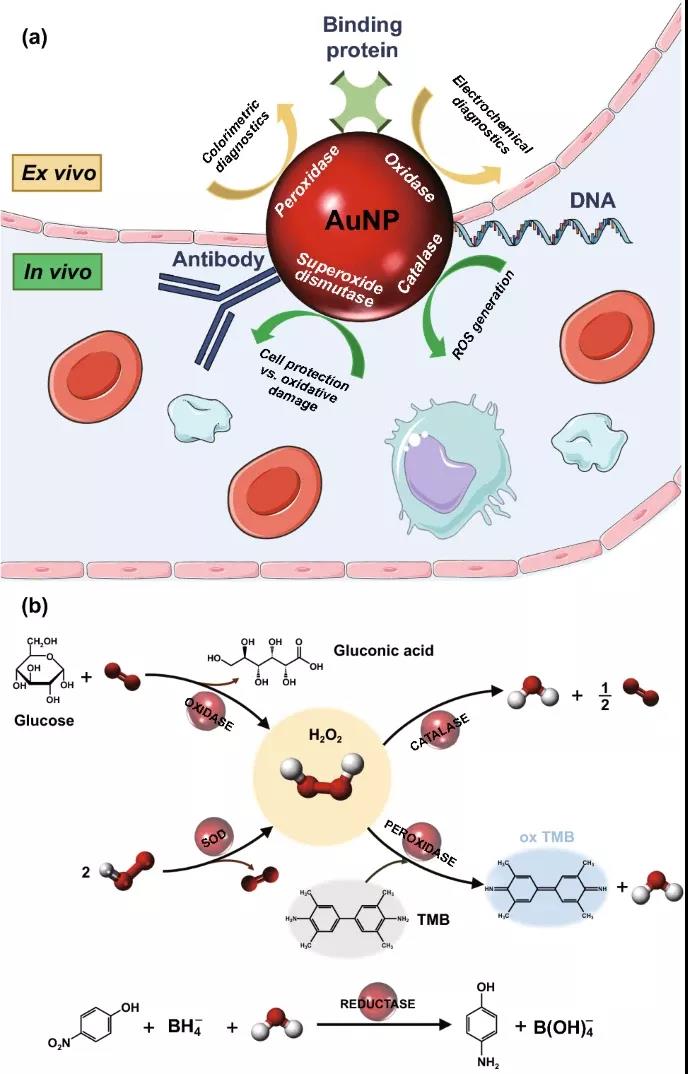 近年來的研究發現,金納米粒子表現出優異的模擬酶活性,類似于過氧化物酶、氧化酶、過氧化氫酶、超氧化物歧化酶或還原酶。與生物酶相比,這種酶具有合成容易、可調性好、生物相容性好、成本低等優點,在生物醫學或生化分析中具有很好的應用前景。