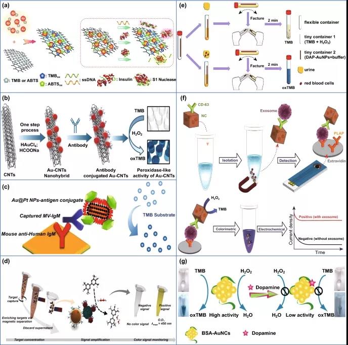 5. 用作臨床診斷工具的AuNPs的過氧化物酶樣活性。(a) 生長在石墨烯片上的AuNP用于開發“開-關”色度傳感器。(b) 納米金/碳納米管雜化技術用于流感病毒的比色檢測。(c) 用于麻疹病毒檢測的棒狀金鉑核/殼納米粒子。(d) 納米磁性微球與金納米粒子聯用分離檢測流感病毒。(e) 方便用戶的尿樣血紅蛋白和紅細胞檢測設備。(f) 載金納米多孔氧化鐵納米粒用于直接外體檢測。
