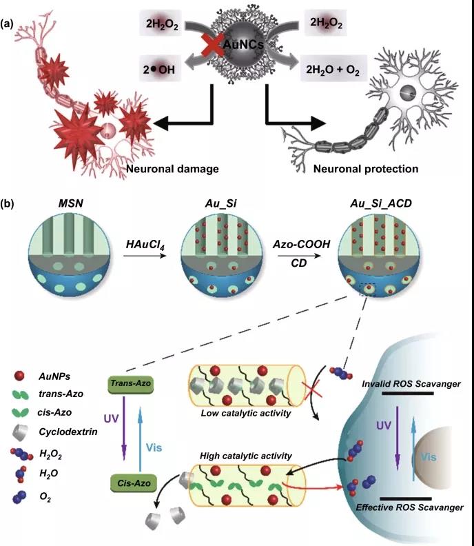 8. 金納米酶用作細胞保護的活性氧清除劑。(a) 胺封端樹狀大分子包埋的AUNC的過氧化氫酶樣活性,用于保護神經元免受氧化損傷。(b) 光介導的載AuNPs介孔NP對ROS水平的可逆調節。