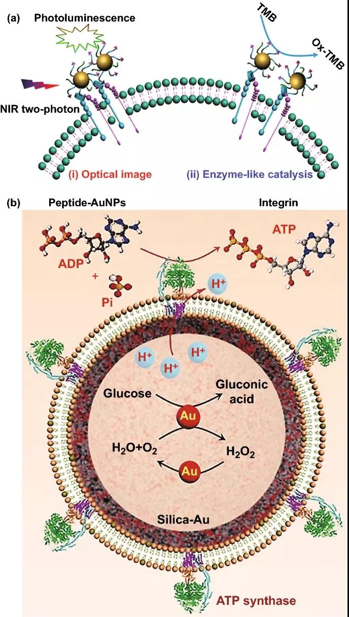 6. 應用于腫瘤治療的金納米酶。(a) 過氧化物酶樣活性與光動力和光熱療法相結合,用于腫瘤成像和局部治療。(b) 在將NPs引導至相應的組織后,各種酶活性結合在一起在細胞內產生ROS。