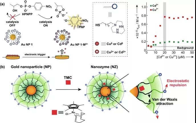 12. 傳統的納米酶定義結合了金納米粒子和金屬離子作為催化劑。(a) AuNP結合單分子膜絡合Cd2⁺和Cu2⁺離子對HPNP的催化裂解。(b) Ru催化劑嵌入AuNPs保護層。