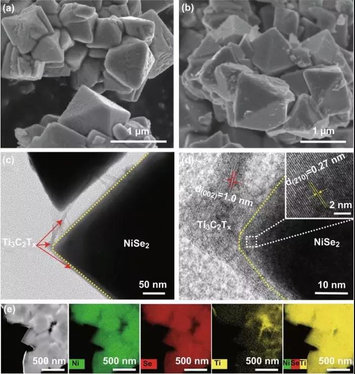 為了彌補(bǔ)這些缺陷,重慶大學(xué)董立春教授課題組采用超薄MXene納米片包裹NiSe2八面體晶體,制備了一種界面相互作用強(qiáng)、電性能優(yōu)良的新型NiSe2/Ti3C2Tx復(fù)合體。