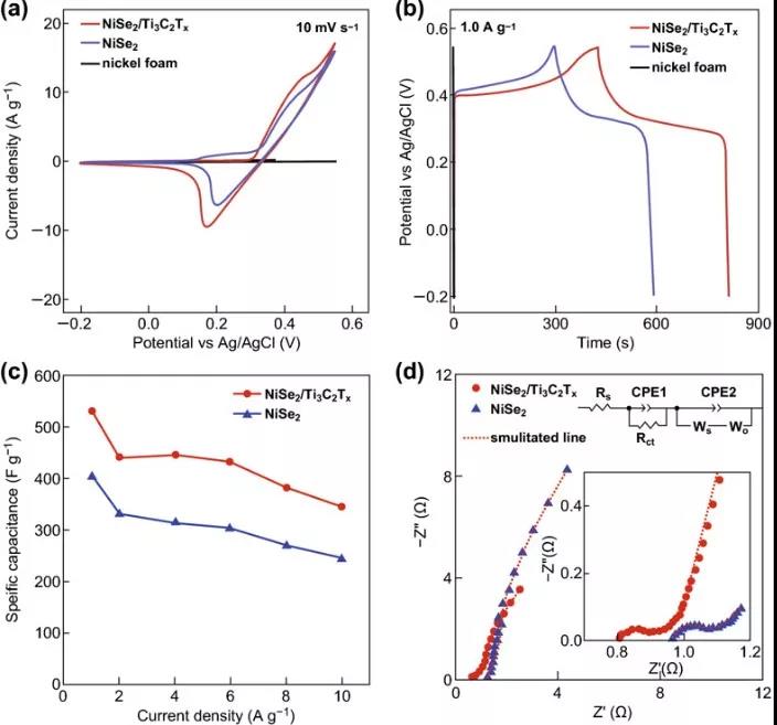 圖3 超級(jí)電容器在2 M KOH溶液中的性能: (a) 未修飾NiSe2和NiSe2/Ti3C2Tx在10 mV/s掃速下的CV圖。(b)未修飾NiSe2和NiSe2/Ti3C2Tx在1.0 A/g電流密度下的GCD曲線。(c)未修飾NiSe2和NiSe2/Ti3C2Tx的電流密度比容圖。(d)未修飾的NiSe2和NiSe2/Ti3C2Tx的Nyquist圖(插圖為高頻區(qū)域和擬合實(shí)驗(yàn)數(shù)據(jù)的等效電路)