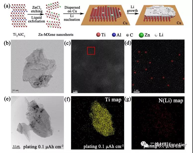 圖 1. a) 固定在 MXene 層 (ZnMXene) 上用于鋰成核和生長的單個鋅原子的合成過程。b) Zn-MXene 納米片的典型 TEM 圖像,顯示出透明特征。c, d) HAADF-STEM圖像,顯示了高密度的亮點(鋅原子)在MXene納米片。e)氮標記后Zn-MXene-Li層在0.1 μAh cm-2電鍍水平下的STEM圖像。相關元素f) Ti和g) N (Li)的分布,表明Li在ZnMXene層上呈均勻形核。
