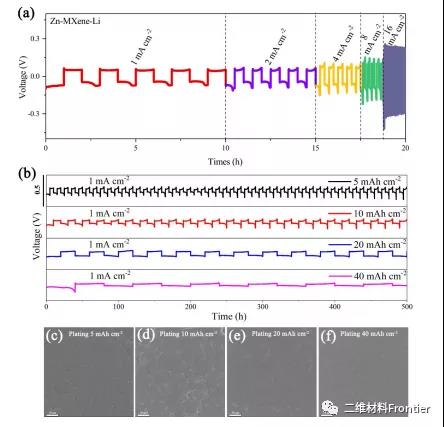 圖 3. a) Zn-MXene-Li 陽極在不同電流密度 (1 -16 mA cm -2) 下的倍率能力。b) 不同容量的 Zn-MXene-Li 負極在 5 -40 mAh cm -2(1 mA cm-2) 范圍內的深度剝離和電鍍行為。c) 5 d、10、e)20和f)40mAhcm-2下的Zn-MXene-Li陽極的掃描電鏡圖像。