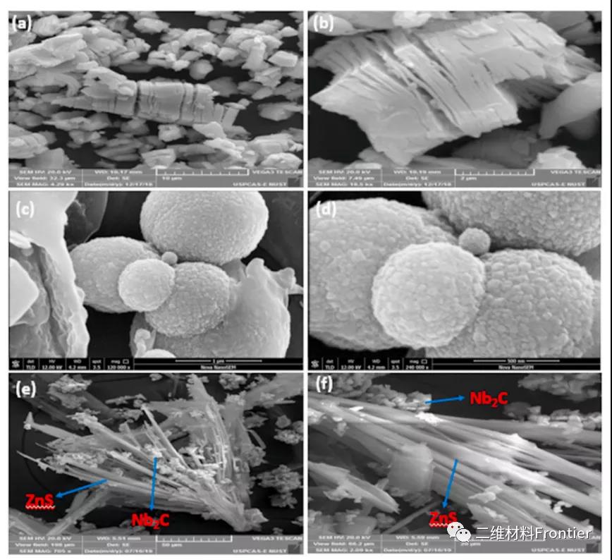 圖1.(a,b)Nb2C分別在10μm和2μm下的SEM結(jié)果,(c,d)硫化鋅團(tuán)聚在1μm和500nm處的SEM圖像,(e,f)Nb2C/ZnS納米復(fù)合材料的SEM圖像。