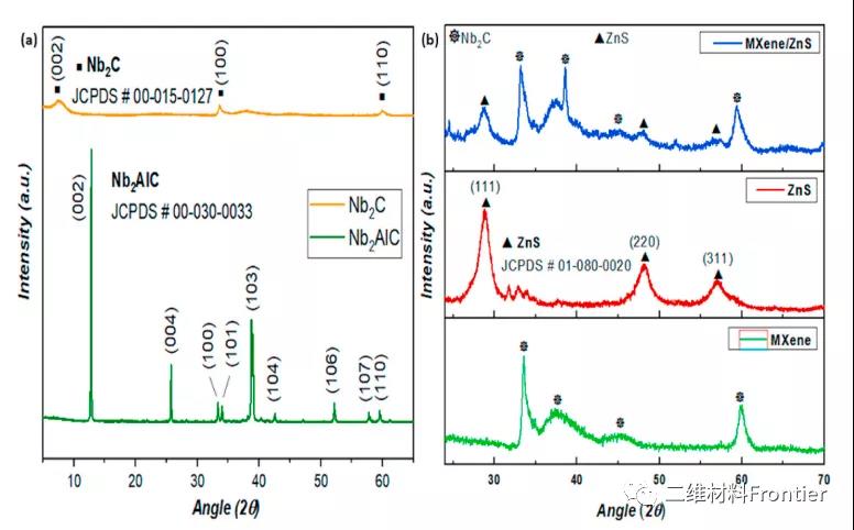 圖2.(a)MXene與MAX相相比的XRD模式,(b)MXene-ZnS納米復(fù)合材料與反應(yīng)物的XRD平行。