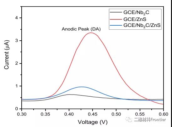 在0.1M磷酸鹽緩沖鹽(PBS)(pH=3)中,通過(guò)DPV以50mv-1掃描速率觀察其在不同修飾GCE電極上電化學(xué)檢測(cè)DA。GCE通過(guò)使用三個(gè)樣本進(jìn)行了修改。Nb2C MXene、硫化鋅和Nb2C /ZnS納米復(fù)合材料。為此目的選擇的電位窗口為0.3~0.6V,最大峰值電流為0.40V~0.435V。