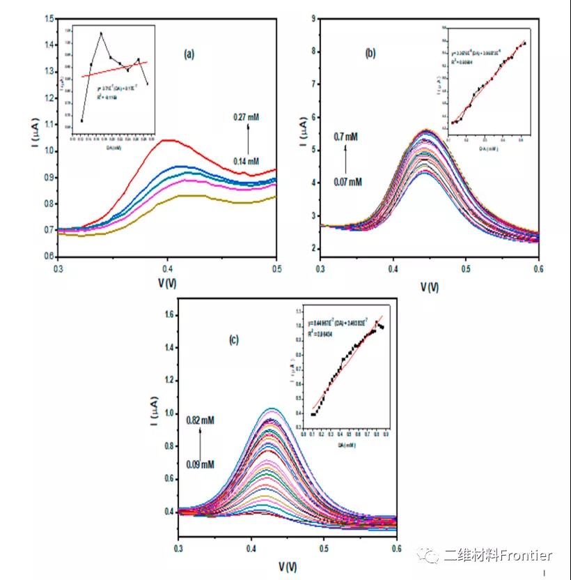 圖4.(a)GCE/Nb2C、(b)GCE/ZnS和(c)GCE/nb2C/ZnS的DPV伏安圖。插入的是對(duì)應(yīng)電極(PBSpH3、掃描率Scat50mVs∓1、步長(zhǎng)電位5mV、步長(zhǎng)電位5mV)的電流與DA濃度的線性圖,間隔時(shí)間為0.5s)。