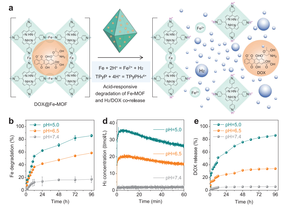 開發既能控制藥物釋放又具有高生物安全性的刺激響應性可降解多孔載體對其臨床轉化至關重要,但目前仍具有挑戰性。本文通過卟啉與零價鐵原子的配位,設計了一種新型的卟啉-鐵金屬有機骨架(Fe-MOF)納米晶體,作為酸降解的藥物載體和氫供體。Fe-MOF納米晶體表現出優異的酸響應降解能力,可以產生氫氣并同時釋放負載藥物,用于癌癥多藥耐藥(MDR)和轉移的氫聯合化療,以及局部氫消除藥物對正常細胞/組織的脫靶毒副作用。在機制上,釋放的H2通過免疫激活瘤內M1表型巨噬細胞,從而下調轉移相關基質金屬蛋白酶-2 (MMP-2)的表達,幫助化療藥物有效抑制腫瘤轉移,并下調MDR癌細胞中p -糖蛋白(P-gp)蛋白和三磷酸腺苷(ATP)的表達,使化療藥物增敏,增強對線粒體和DNA的損傷。高抗MDR/抗轉移性和高生物相容性使Fe-MOF納米晶體和基于Fe-MOF的納米藥物具有很高的臨床轉化潛力。