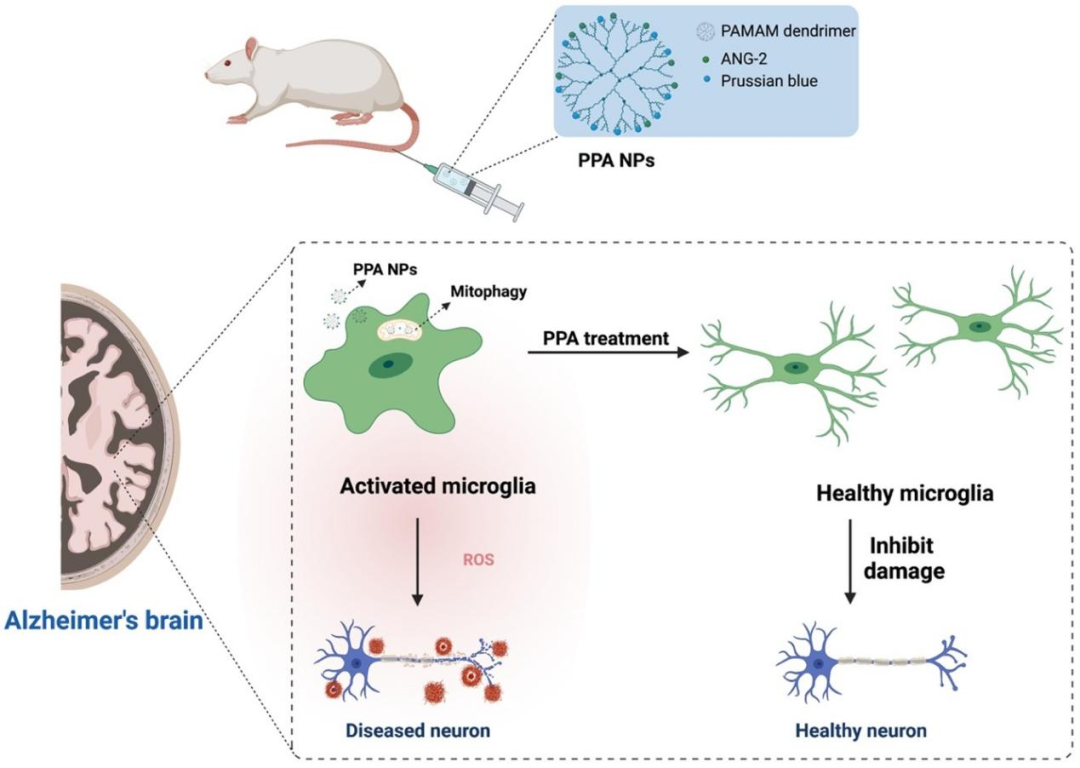 目前專注于抑制Aβ聚集的阿爾茨海默病 (AD) 治療未能在已經出現阿爾茨海默病癥狀的人群中顯示出有效性。協同發揮神經保護作用和緩解氧化應激的策略可能是糾正病理性腦微環境的一種有前途的方法。基于小膠質細胞在調節AD微環境中的關鍵作用,我們在此描述了普魯士藍/聚酰胺胺 (PAMAM) 樹枝狀大分子/Angiopep-2 (PPA) 納米顆粒的開發,該納米顆粒可以調節小膠質細胞的線粒體自噬,作為潛在的 AD 治療。PPA 納米粒子表現出優異的血腦屏障 (BBB) 滲透性,并發揮 ROS 清除和恢復小膠質細胞線粒體功能的協同作用。PPA 納米粒子有效減少神經毒性 Aβ 聚集體并拯救 APP/PS1 模型小鼠的認知功能。總之,我們的數據表明,這些多功能樹枝狀大分子納米粒子表現出有效的神經保護和小膠質細胞調節,可作為治療 AD 的有前景的方法。