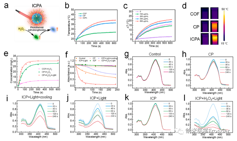 圖3.(a)單波長近紅外輻射下具有自增強方式的ICPA示意圖。(b) 各種納米粒子 (600 μg/mL) 在 808 nm 光照射 (1 W/cm2) 下的光熱曲線和 (d) 光熱圖像。(c) 808 nm激光(1 W/cm2)下不同濃度ICPA的光熱曲線。(e)通過溶氧儀測量不同處理的不同材料的產氧能力。(f)不同納米顆粒引起的DPBF吸收衰減率。(g)–(l)不同處理后DPBF的紫外可見光譜。