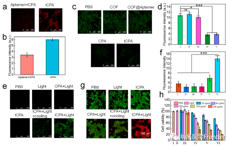 Pt-COF-Apt納米平臺具有良好的水溶性、穩定性、生物相容性和腫瘤靶向能力。在體外實驗中,Pt-COF-Apt納米平臺能夠有效地識別和殺死腫瘤細胞,表現出高效的光催化治療效果。在體內實驗中,Pt-COF-Apt納米平臺能夠有效地聚集在腫瘤部位,產生大量的活性氧物種,從而抑制腫瘤的生長和轉移。該實驗證明了Pt-COF-Apt納米平臺作為一種新型的光敏劑,為腫瘤靶向的自增強光催化治療提供了一種新的策略。光催化治療是一種利用光敏劑在光照下產生活性氧物種,從而殺死腫瘤細胞的方法。該方法具有無創、高效、低毒性等優點,但也存在一些問題,如光敏劑的穩定性、選擇性和光催化效率等。