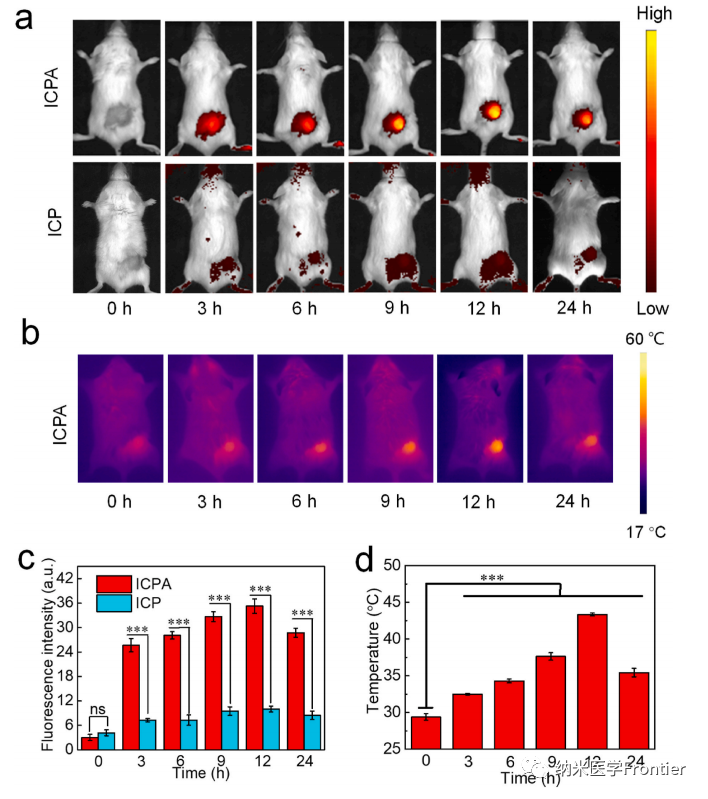 圖5.(a)在不同時間點注射ICPA或ICP的4T1荷瘤小鼠的體內熒光成像和(c)(a)中腫瘤區域熒光強度的量化。(b)靜脈注射ICPA后不同時間點小鼠的熱圖像和(d)(b)的溫度量化。(*p < 0.05,**p < 0.01,***p < 0.001)。