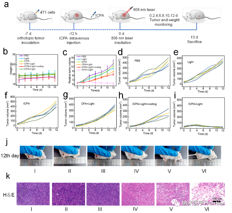 圖6.(a)動物實驗示意圖。(b) 接受不同處理的小鼠12天內體重變化曲線。(c)不同組的相對腫瘤體積。(d–i) 不同治療小鼠的腫瘤體積。(j)不同治療后荷瘤小鼠的照片。(k)不同處理后腫瘤切片的H&E染色。(I,PBS;II,光;III,ICPA;IV,CPA + 光;V,ICPA + 光 + 冷卻;VI,ICPA + 光)。