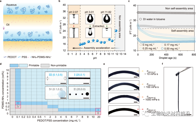 導電水凝膠需要可調節的機械性能、高電導率和復雜的 3D 結構,才能在(生物)應用中實現高級功能。在這里,本文設計了一種簡單的策略,通過可編程打印油內富含聚(3,4-乙撐二氧噻吩):聚(苯乙烯磺酸)(PEDOT:PSS)的水性墨水來構建3D導電水凝膠。在這種液包液印刷方法中,來自水相的PEDOT:PSS膠體顆粒和來自另一相的聚二甲基硅氧烷表面活性劑的組裝體在液-液界面形成彈性膜,從而將水凝膠前體油墨捕獲在設計的3D非平衡形狀中,以便隨后凝膠化和/或化學交聯。在兩個互穿水凝膠網絡中,當 PEDOT:PSS 含量低至 9mgmL−1 時,電導率高達 301 S m−1。輕松的可印刷性使我們能夠調整水凝膠的成分和機械性能,從而促進這些導電水凝膠作為電微流體設備的使用,并在未來定制近場通信(NFC)植入式生物芯片。