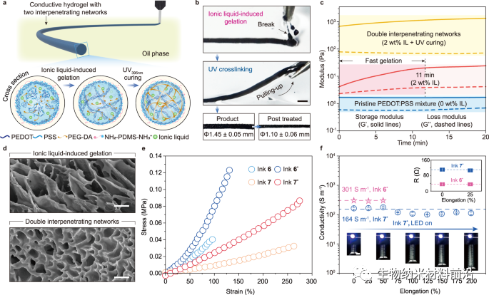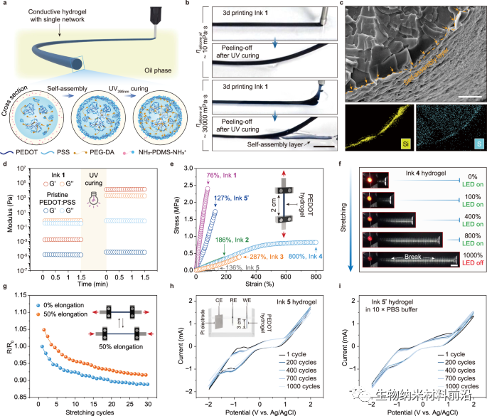 圖 1:具有可調節形態、機械性能和電導率的水凝膠3D 打印。