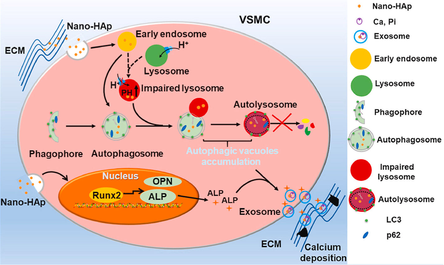 血管鈣化(VC)是衰老、糖尿病、慢性腎功能衰竭和動(dòng)脈粥樣硬化的共同特征。VC的基本成分是羥基磷灰石(HAp)。納米大小的HAp(nHAp)已被確定在脈管系統(tǒng)病理性鈣化的發(fā)展中起重要作用。然而,nHAp是否可以在體內(nèi)誘導(dǎo)鈣化以及nHAp在VC進(jìn)展中的機(jī)制尚不清楚。我們發(fā)現(xiàn)nHAp存在于患者鈣化動(dòng)脈中的血管平滑肌細(xì)胞(VSMC)及其細(xì)胞外基質(zhì)(ECM) 中。合成的nHAp與從鈣化動(dòng)脈中回收的天然nHAp具有相似的形態(tài)和化學(xué)特性。nHAp在體外刺激成骨分化并加速VSMC的礦化。合成的nHAp也可以在體內(nèi)直接誘導(dǎo)VC。從機(jī)制上講,ATPase用于酸化,因此阻止了VSMC中的自噬流。通過(guò)環(huán) 3’,5’-腺苷單磷酸(cAMP) 進(jìn)行的溶酶體再酸化顯著增強(qiáng)了自噬降解并減弱了nHAp誘導(dǎo)的鈣化。積累的自噬體和自溶酶體轉(zhuǎn)化為含鈣的外泌體,分泌到ECM中并加速血管鈣沉積。VSMC中外泌體釋放的抑制減少了鈣沉積。總而言之,我們的結(jié)果證明了nHAp對(duì)溶酶體酸化的抑制作用,這抑制了自噬降解并促進(jìn)了積累的自噬空泡轉(zhuǎn)化為裝載有未溶解的nHApCa 2+的外泌體, Pi和ALP。這些外泌體從質(zhì)膜上萌芽,沉積在 ECM 內(nèi),并形成鈣結(jié)節(jié)。因此,nHAP通過(guò)阻斷VSMC中的自噬流來(lái)加速血管鈣化。