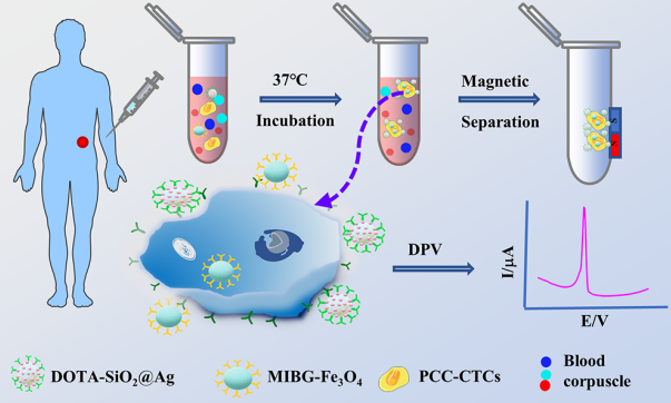 Circulating tumor cells (CTC) play a key role in the early diagnosis of pheochromocytoma (PCC). Here, we generated a new dual-targeting nanoprobe for the simultaneous identification of rare PCC-CTC from peripheral blood by targeting PCC cell surface overexpressed noradrenaline transporter (NET) and the somatostatin receptor SSTR 2. Interiodibenzyl guanidine (MIBG) -functionalized magnetic Fe3O4 and octreotide (DOTA) -modified signal amplification Ag @ SiO 2 nanospheres capture and detect PCC-CTC by binding to NET and SSTR 2. The proposed dual-targeting sensor has good reproducibility and high sensitivity for PC12 monitoring in a concentration range of 5 – 5104 cells / mL, with a detection limit of 2 cells / mL. This strategy opens up a simple, sensitive, rapid determination of PCC biomarkers, showing great potential for early diagnosis, prognosis and therapeutic evaluation of PCC.