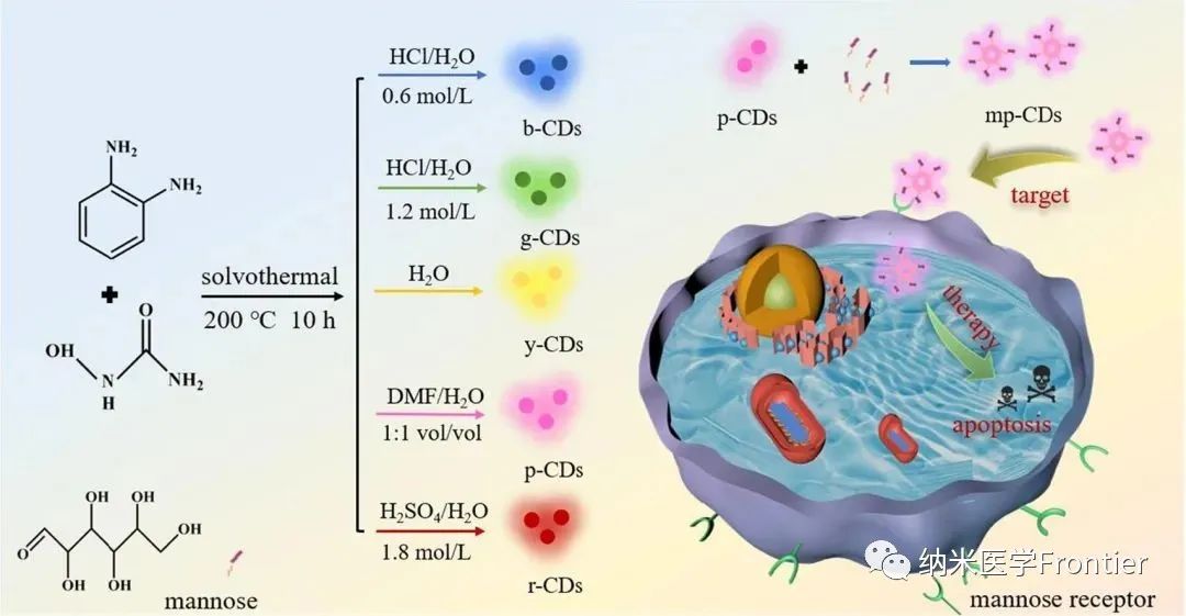 為了提高p-CDs在生物醫學中的應用價值,研究人員利用甘露糖修飾了p-CDs的表面,得到了甘露糖修飾的p-CDs(mp-CDs)。mp-CDs可以選擇性地靶向腫瘤細胞,因為腫瘤細胞表面有過表達的甘露糖受體。mp-CDs通過內吞作用進入腫瘤細胞內部,在紫外光下發出明亮的粉紅色熒光,從而可以用裸眼辨別肝癌細胞。