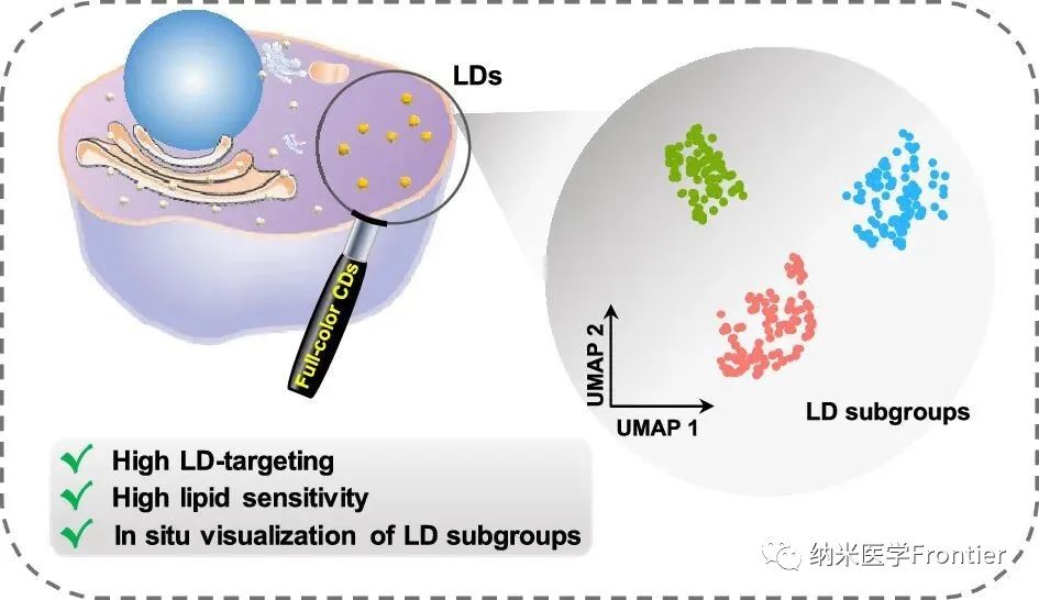 Full-color CDs是一種具有全彩色熒光發射的碳量子點,它們由多種功能化的碳納米材料組成。Full-color CDs具有親脂性和表面發光的特點,這使得它們可以靶向細胞內儲存中性脂質的細胞器——脂滴(LDs)。脂滴在維持細胞和機體的能量代謝平衡中起著重要作用,其內部脂質成分的變化與許多代謝性疾病相關。Full-color CDs可以通過對熒光信號高度敏感響應內部脂質成分中的細微差別,從而實現對脂滴內部結構和功能的可視化和定量分析。這種利用Full-color CDs實現脂滴成像和檢測的方法為研究脂滴與代謝相關的生物學問題提供了新的工具和策略。